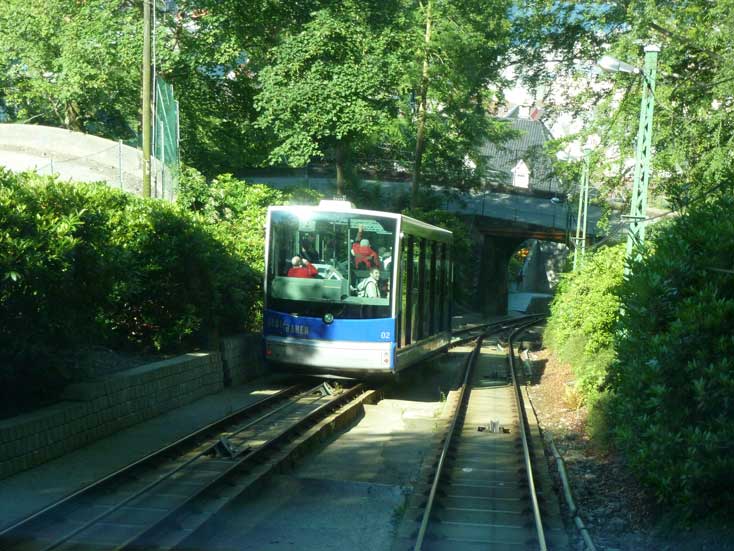 We could see the fjords through which we had sailed yesterday on NORDSTJERNEN to arrive here in Bergen Harbour; we could see the mountains, the sunlight glistening on the water down below and a coffee shop in front of us. Outside this was an elevated rail, and two little miniature funicular carriages, one going up and one going down, exactly like the real ones!