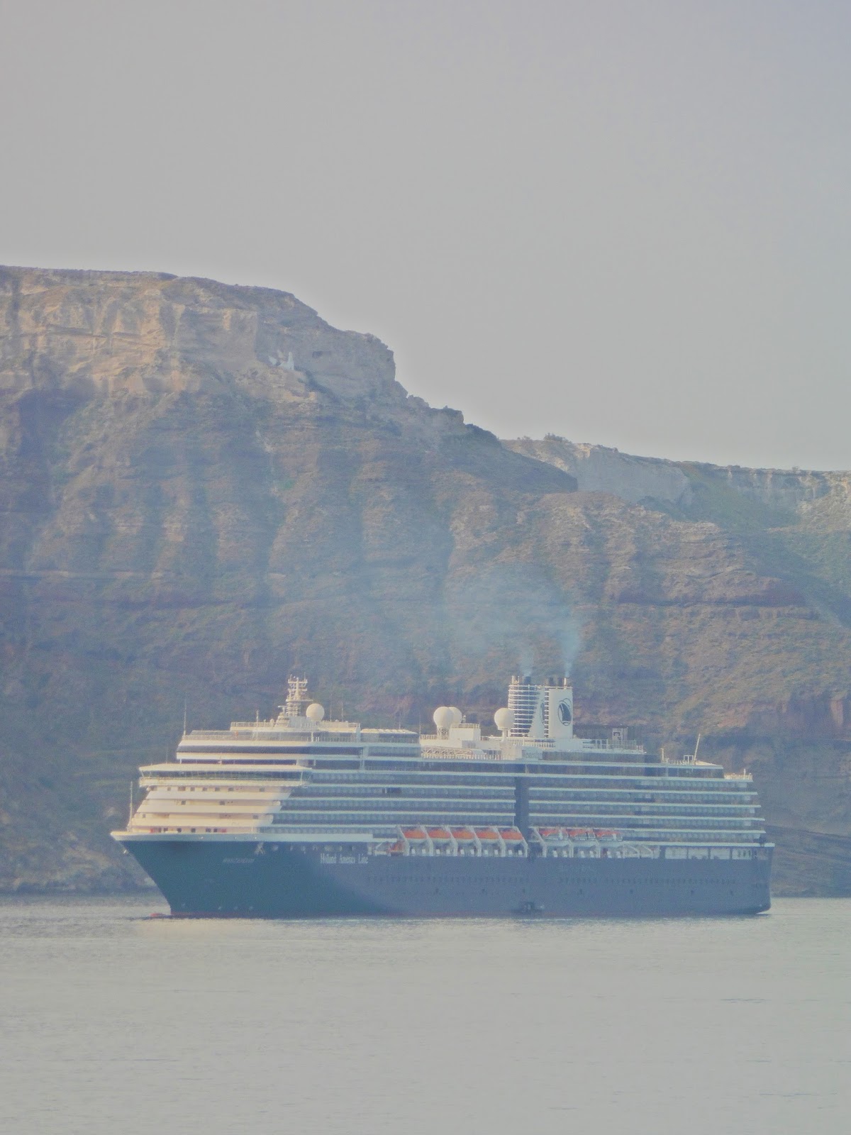 Back on board I enjoyed a glass of sparkling wine before lunch at the outdoor Thalassa Bar and lido buffet before settling in a shaded steamer chair for an afternoon rest. Later we could see various ships arriving and departing from the ferry port and the tenders taking passengers back to their cruise ships in the caldera. All these big ships cannot anchor because of the enormous water depth, so the engines are constantly working to keep them in position, usually tied up to an allocated and fixed buoy.