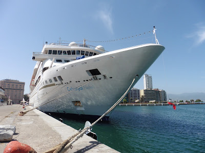 Gala Night meant 'the posh frock' for ladies and drinks and photos with Captain Nektarios Rigas, before heading into the Muses Theatre for introductions of all of his Senior Officers and Department heads. We sat with our new friends, including the lad with his toy model ferries this time. We were introduced to his father (one of the Senior Officers) and I realised that I had met him before: way back in July 2008 I had been with other ferry friends on a visit to a Japanese ship being converted in the Keratsima repair yard near Piraeus and the little lad's father had been kind enough to show us around. The ship then was the AEGEAN HEAVEN, the ex-SUNFLOWER TOMAKOMAI, which was being converted to a ro-ro cargo ship at 23,503 gross tons. She is now named AYSHE, with the EKOL Line, and this is the ship we could see part of this afternoon in Izmir port.